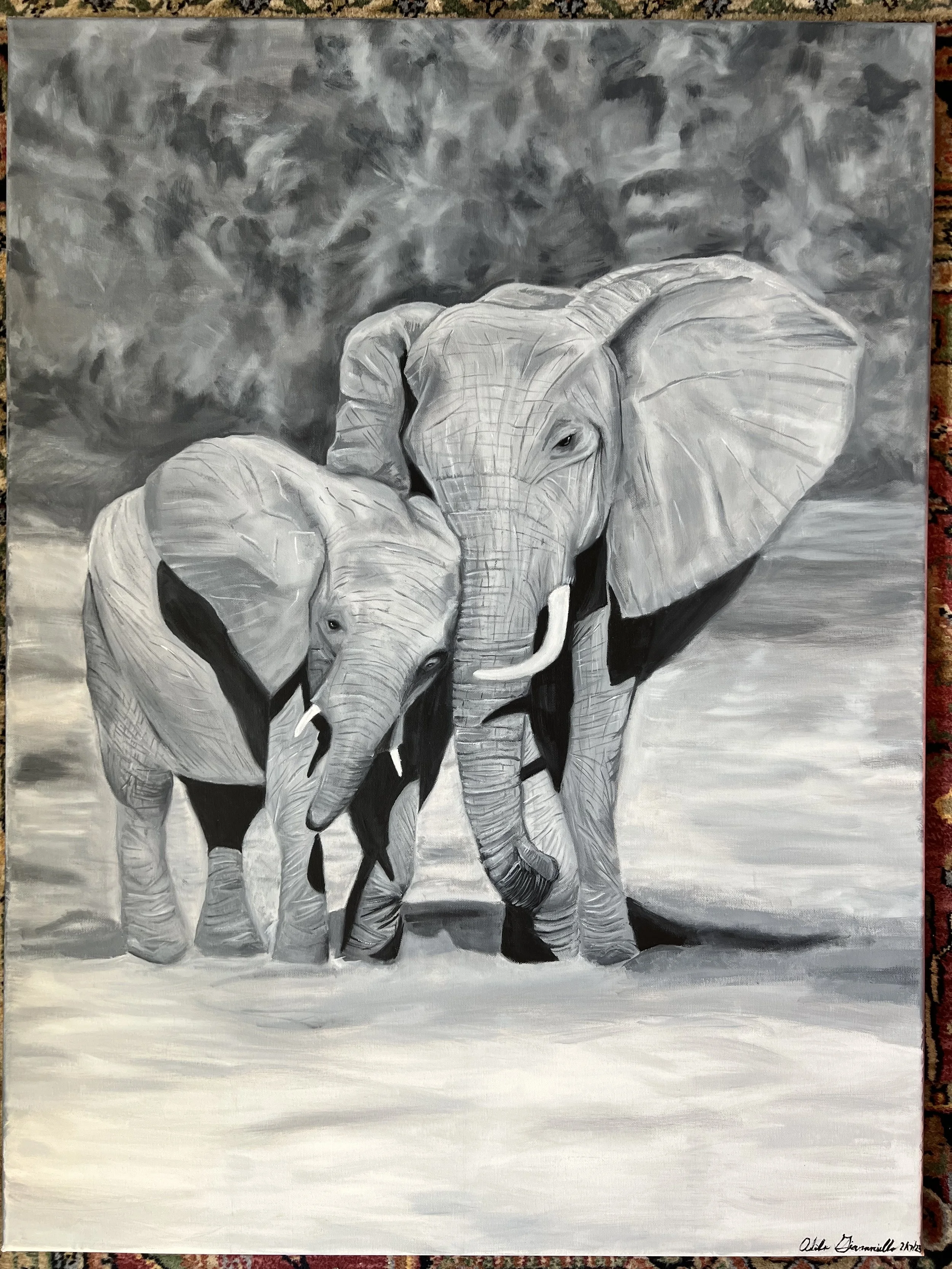 A large and small elephant are nestled together against a landscape. They are on the move while their heads touch. The two creatures rest on a white ground and swirling gray background. A black and white scene of kinship between two monumental creatures mediates their bodily prowess, reminding viewers of their sweetness.